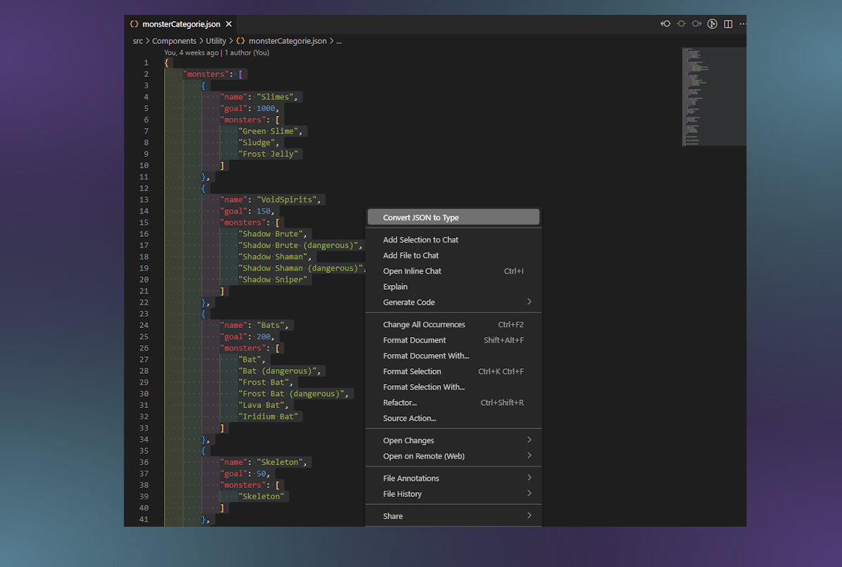 Not quite properly scoped when I thought about it but I did had a couple of things in mind for this application, I knew I wanted to be able to convert any selected JSON in the editor into a fully typed TypeScript definition. That being able to support nested structures, have smart extraction, and proper naming was a must and I wanted to make it accessible through a context menu in the editor. other than that the code needed to be clean for future upgrades and of course the extension had to be up in the marketplace so I could actually use it.
